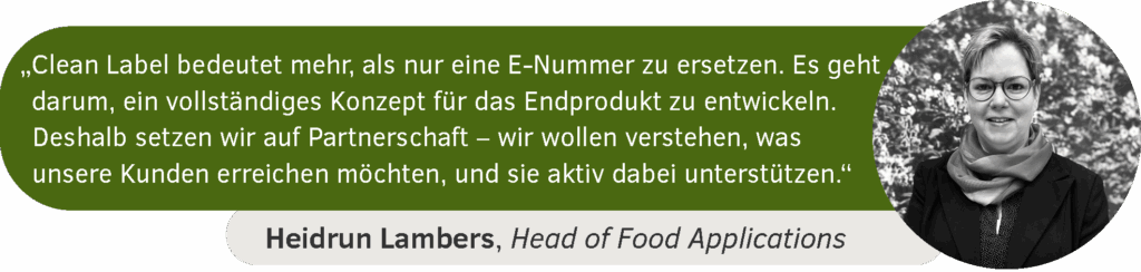 Clean Label ist mehr als nur ein Trend – es ist ein grundlegender Wandel in der Lebensmittelentwicklung. Deshalb geht der Ansatz der Emsland Group weit über die Lieferung von Clean-Label-Zutaten hinaus. Durch praxisnahe Anwendungstechnik, Rezepturentwicklung und umfassende Inhouse-Tests im firmeneigenen Innovation Center unterstützen wir unsere Kunden dabei, verbraucherfreundliche Produkte schneller und gezielter zur Marktreife zu bringen.
