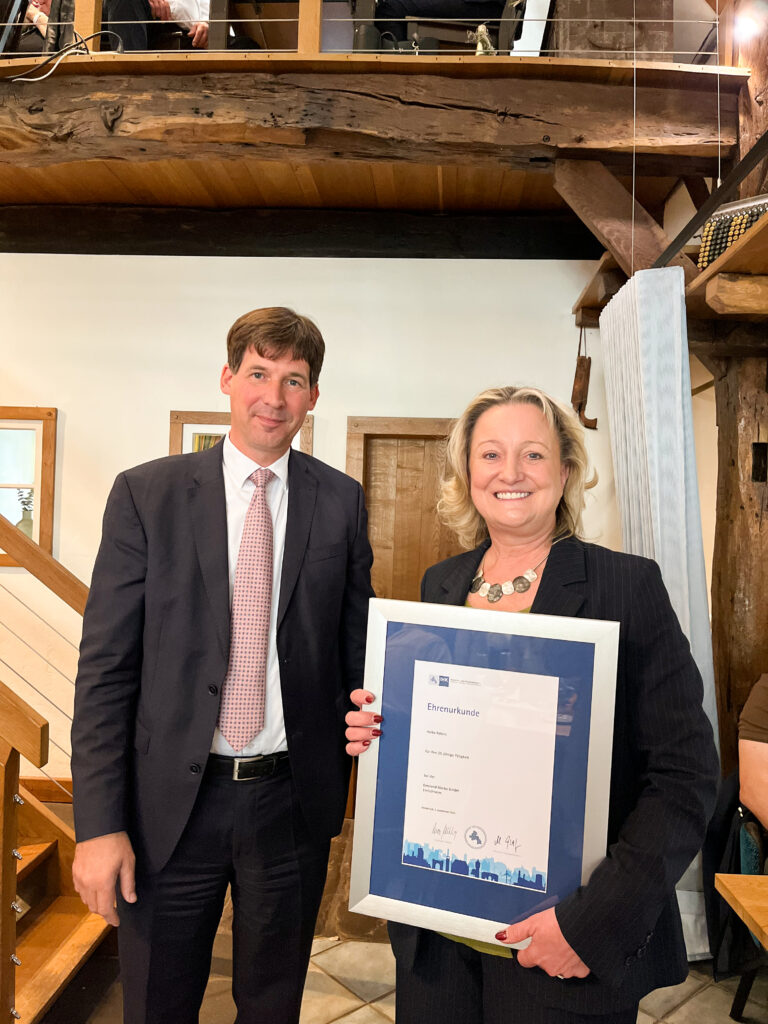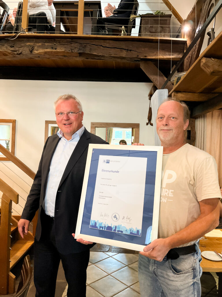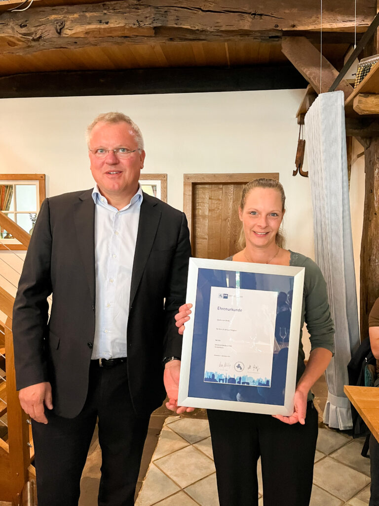 Ein besonderer Moment in diesem Jahr: Auch zwei bekannte Gesichter aus dem engsten Kreis der Geschäftsführung durften ihre Jubiläen feiern – Stefan Hannemann, Geschäftsführer, für 35 Jahre Betriebszugehörigkeit sowie Heike Roters, Assistenz der Geschäftsführung, für 25 Jahre. Beide erlebten die Feier einmal aus einer anderen Perspektive und konnten ihre Ehrung in vollen Zügen genießen.