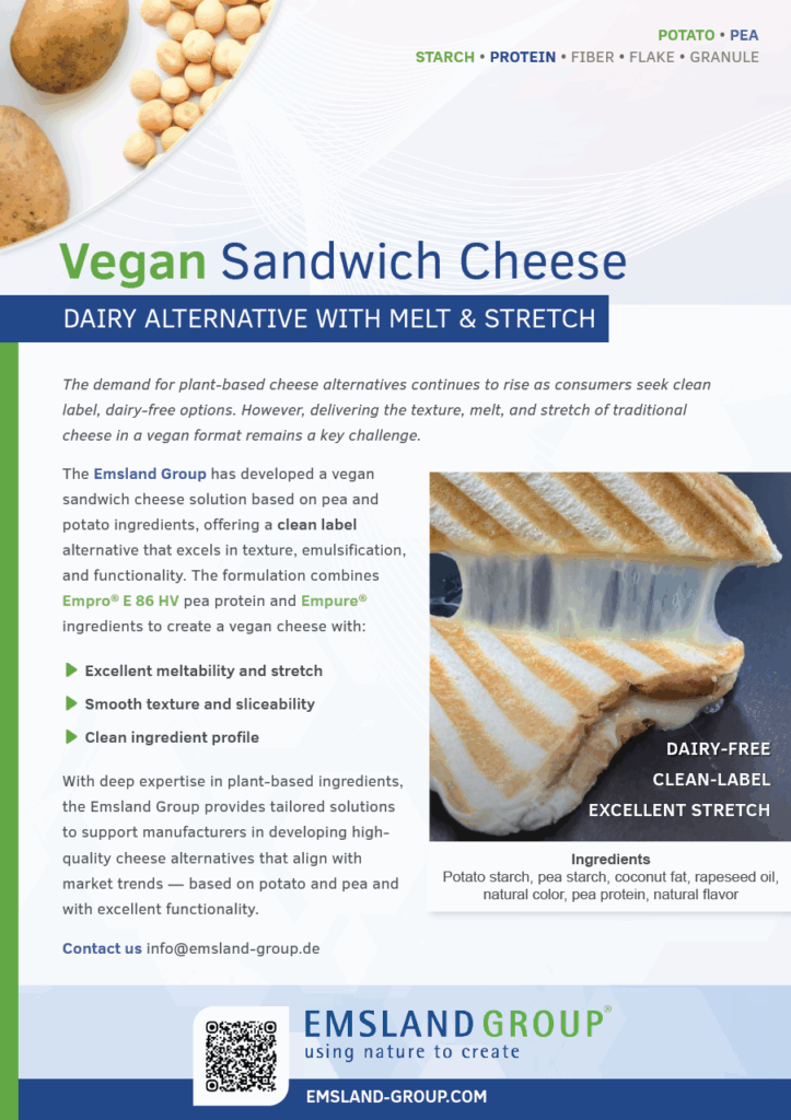 The Emsland Group has developed a vegan sandwich cheese solution based on pea and potato ingredients, delivering a clean label, dairy-free alternative with outstanding functionality.